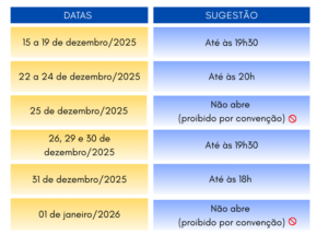 A CDL Uberlândia informa que, em razão das festividades de fim de ano, o comércio da cidade adotará horários especiais de funcionamento, com o objetivo de melhor atender aos consumidores e fortalecer as vendas do varejo local. A sugestão de horários apresentada abaixo, considera as intenções levantadas junto aos associados.